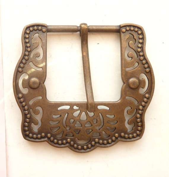 Antique finish full buckle Die cast full buckle with assorted levels of antique brass finish.