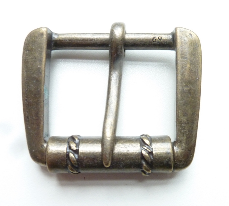 Corded roller buckle Die cast buckle in Old Brass finish with distinctive cord pattern on roller.