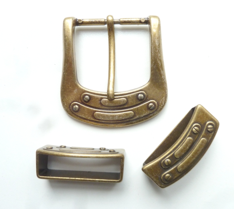 Little belt buckle, loop & tip set Die cast buckle, loop & belt tip set in Old Brass finish.