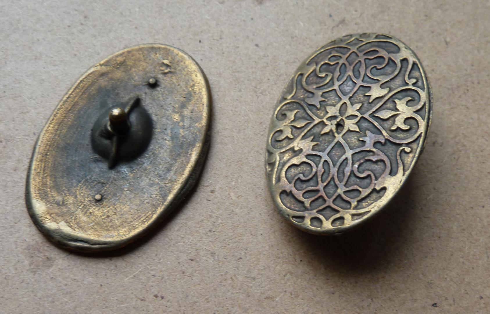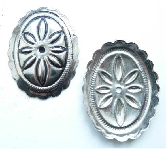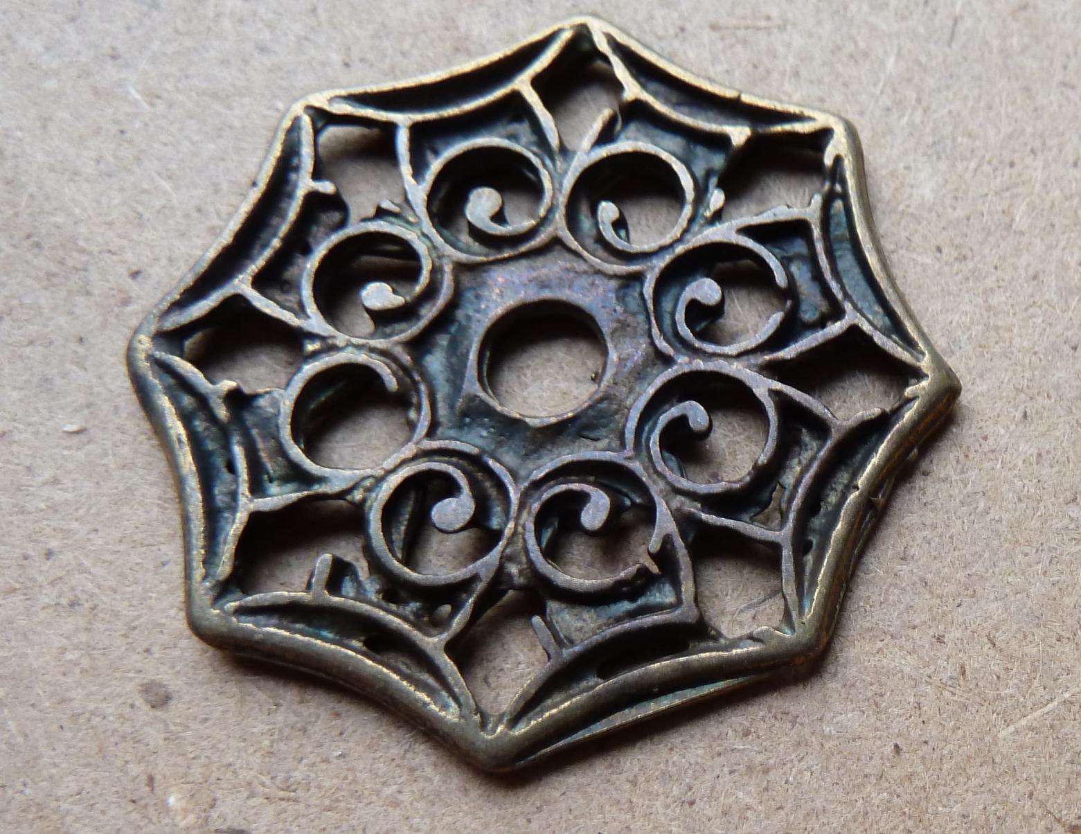 Base metal rivet on decorative fitting in pewter or old brass finish.