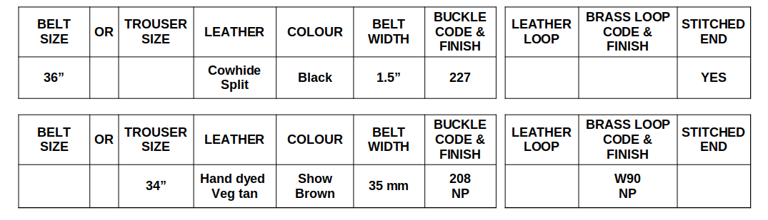 Costs shown in the table below are the Base Cost - this covers the cost for the leather belt strap with a steel or die-cast belt loop and the buckle end of the strap fixed with rivets. Remember to include the cost of which ever buckle you choose for the belt.
