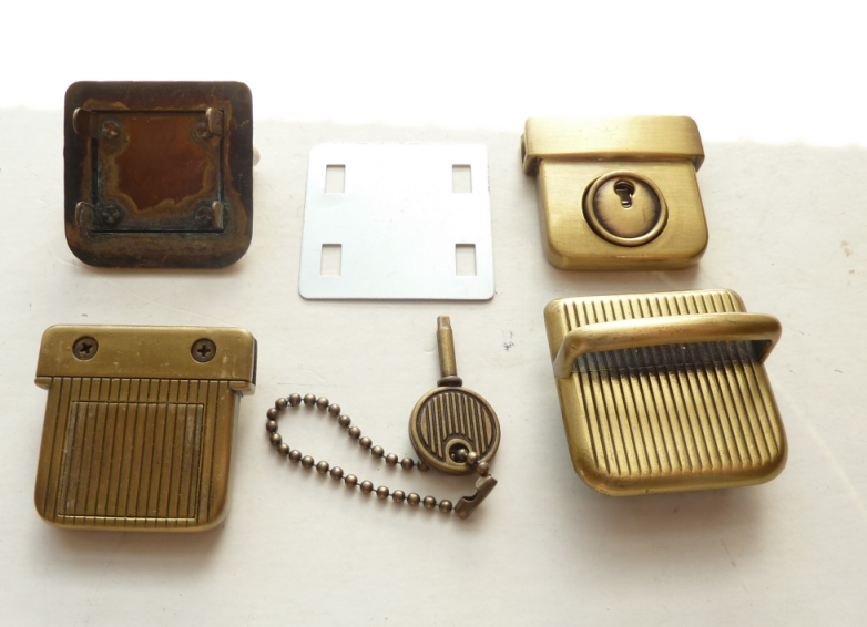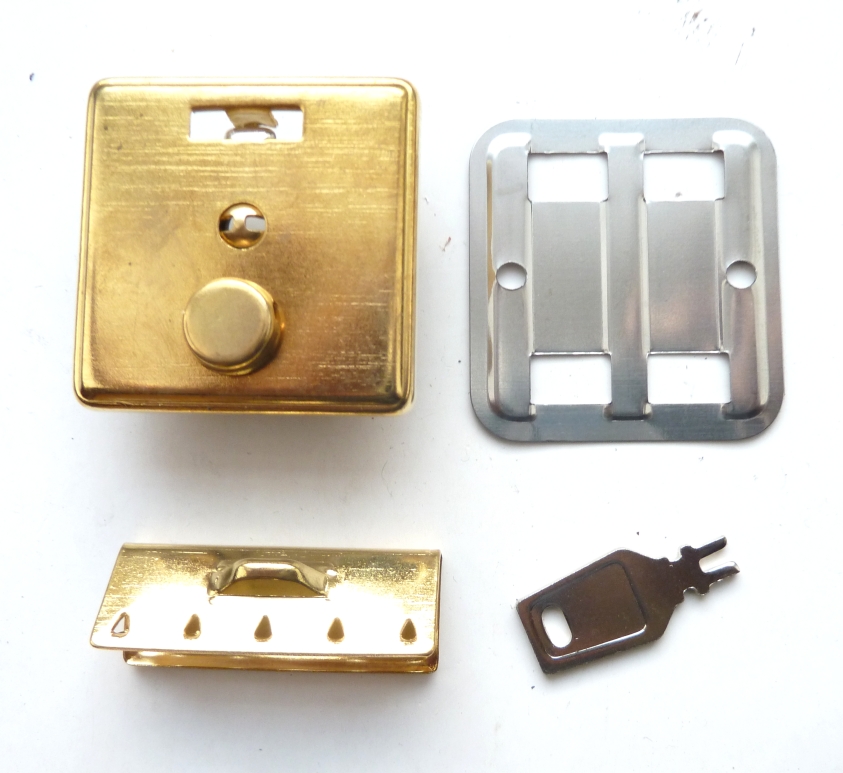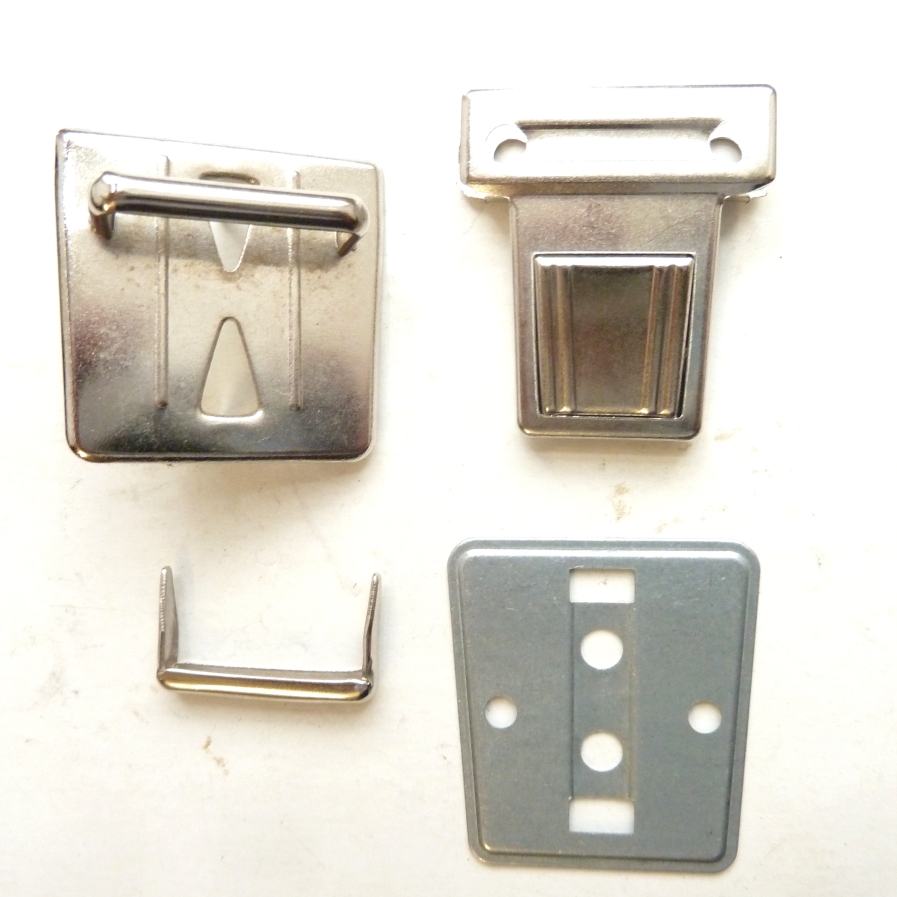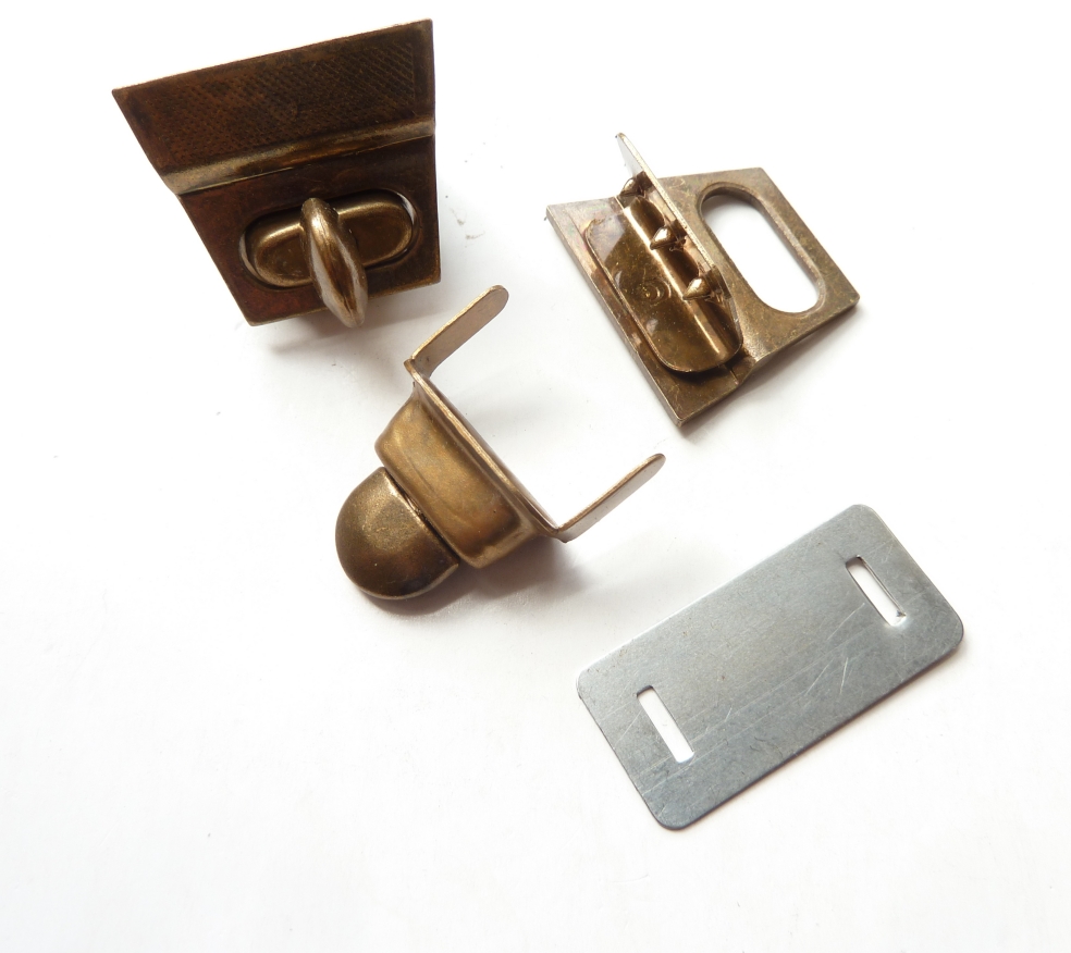 Lock plate crimps onto strap (25 mm wide) or flap. Turn lock secures with folding tabs on rear.