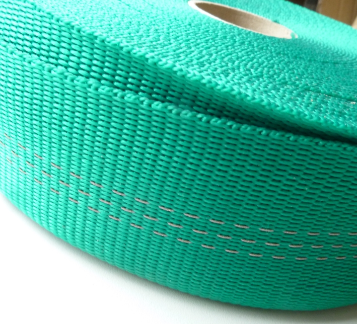 Green webbing - central pinstripe Roll of 50 mm wide polypropylene webbing.