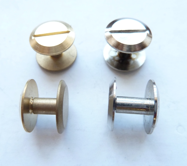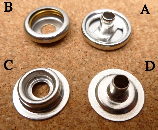 F17 standard hold press studs but Part D has 9 mm long stem (standard is 6 mm) - allows part C to be set through several layers of thicker leather.